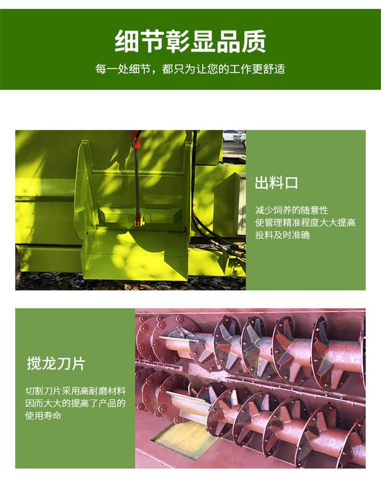 可以直接将青贮饲料,各种草捆,稻草和其他纤维饲料放入搅拌机中展开切碎和混合。混合速度快。每批饲料的切割和混合时间约为20分钟,根据罐体的尺寸,每个饲料搅拌机每天可以喂200-2000头牛和羊,可以取而代之20多名工友的工作,减小了工友劳动强度大,提高饲养效率。